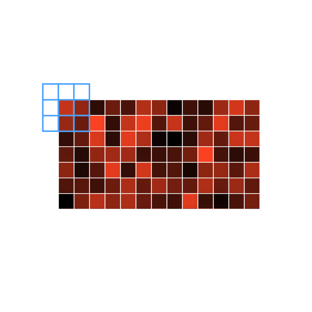 As you can see, each pixel's color bleeds onto its neighbors, as we are averaging the pixel values. This creates the illusion of blurring the image. (Note that since the area outside the image is not defined, when the kernel is placed on a border row or column, it will not know what value to use for the calculation. Multiple options are possible for handling this: https://en.wikipedia.org/wiki/Kernel_(image_processing)#Edge_handling)