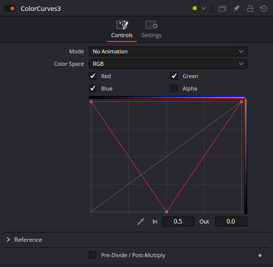 The zone of sharpness can be viewed as a zero value in the blur image. To achieve this, we need a curve to define where its value will be set to 0. So, grab a Color Curve node and draw a "V" shape (or an "A" shape, depending on whether your Z map is flipped). Don’t forget to uncheck the Alpha channel checkbox: