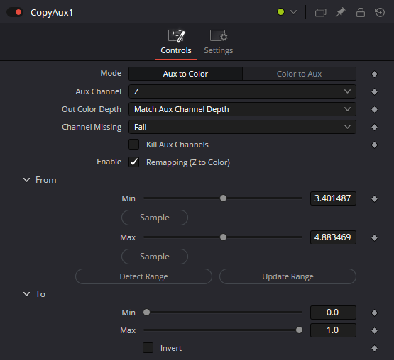 I didn’t find any other way to do it than by using a node called Copy Aux. I guess we could do it with a color curve, but since depth values can be pretty extreme, it would be quite tricky.