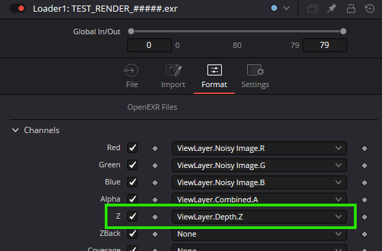 The orange input is your image, and the green input is your depth information. Note that you don’t need to have a Z channel in your image channels, but it’s better, since the channel used will be set to Z by default. To do that, go to your loader node and choose Format. In the Z field, choose the corresponding layer from your multilayer file. Now, when you press Z in the viewport, you’ll see the Z channel of your flow. Note that you’ll potentially have a full black or full white image, and this is the cause of our problem.